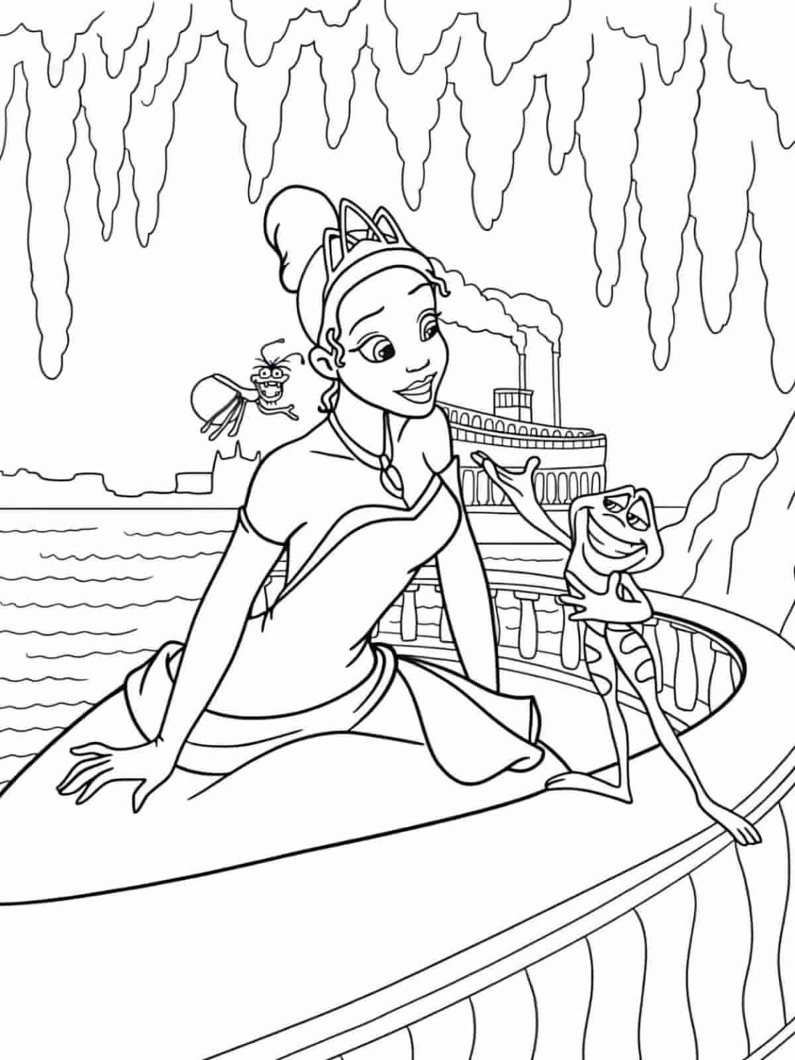Princess Tiana and the frog sitting on a tree branch overlooking the bayou and its beautiful scenery freely.
